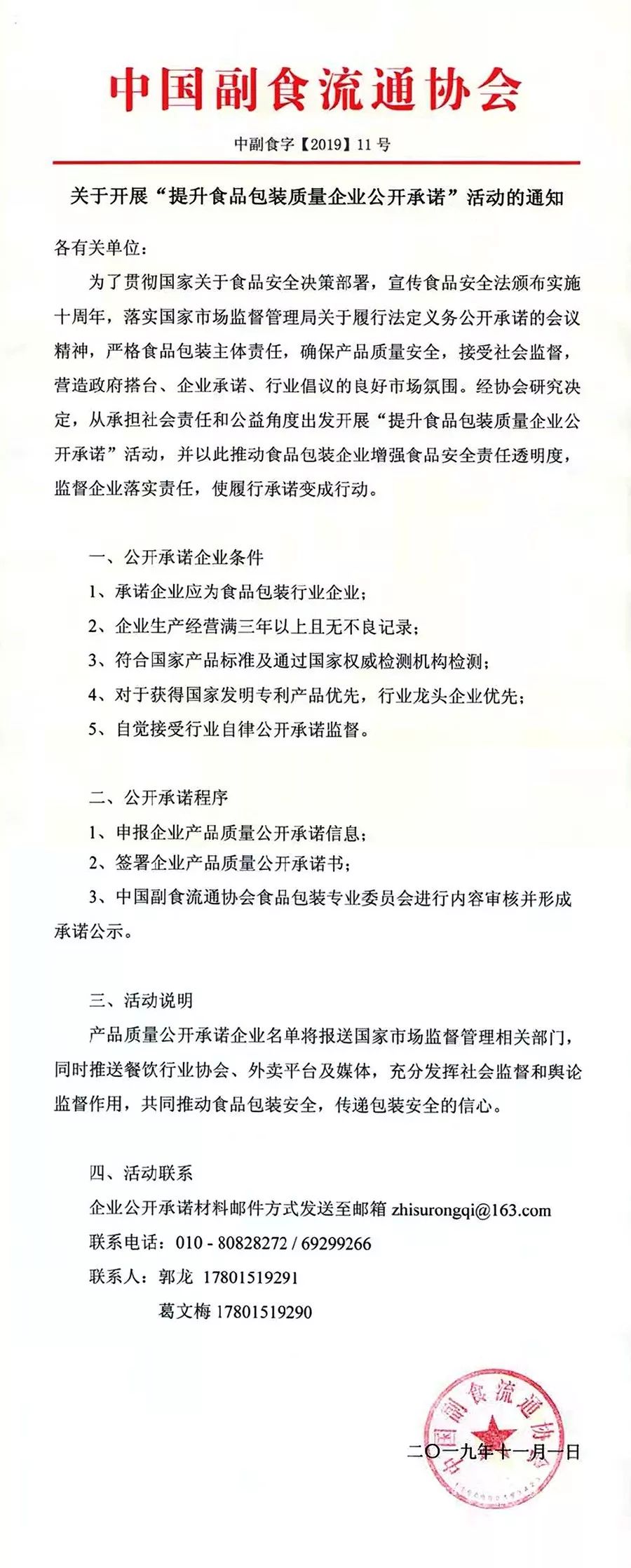 為了貫徹國(guó)家食品安全決策部署,落實(shí)國(guó)家市場(chǎng)監(jiān)督局關(guān)于企業(yè)履行法定義務(wù)公開(kāi)承諾的會(huì)議精神,嚴(yán)格食品包裝主體責(zé)任,確保產(chǎn)品質(zhì)量安全,接受社會(huì)監(jiān)督,營(yíng)造政府搭臺(tái)、企業(yè)承諾、行業(yè)倡議的良好市場(chǎng)氛圍,中國(guó)副食流通協(xié)會(huì)從承擔(dān)社會(huì)責(zé)任和公益角度出發(fā)開(kāi)展“提升食品包裝質(zhì)量企業(yè)公開(kāi)承諾”活動(dòng)。