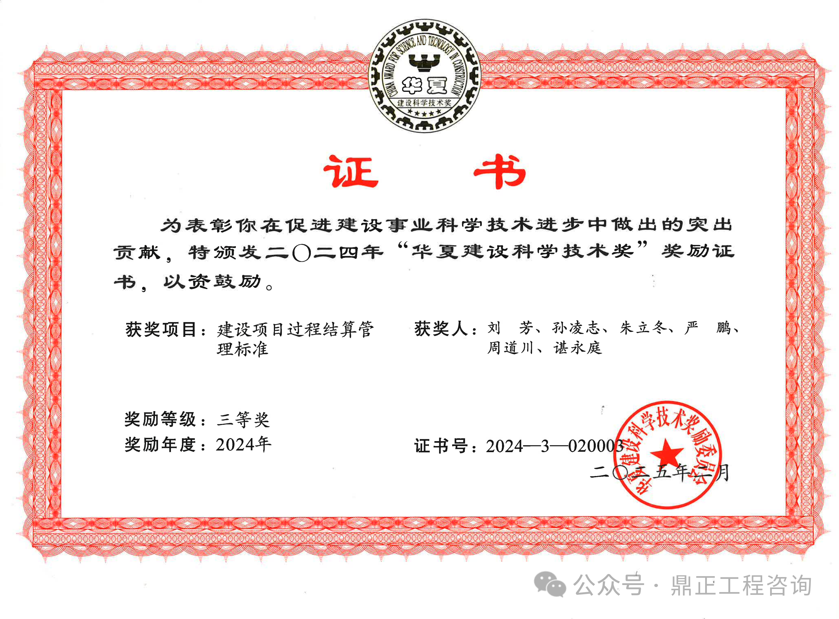 鼎正參與編制的《建設(shè)項(xiàng)目過(guò)程結(jié)算管理標(biāo)準(zhǔn)》(T/CECS 1178-2022)通過(guò)專(zhuān)業(yè)組和評(píng)審委員會(huì)的兩級(jí)評(píng)審,從700余個(gè)報(bào)送項(xiàng)目中脫穎而出,榮獲2024年度華夏建設(shè)科學(xué)技術(shù)獎(jiǎng)三等獎(jiǎng)。